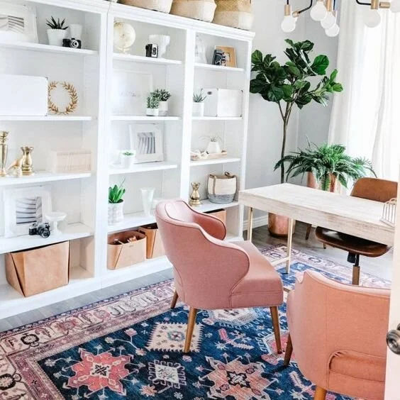 One of the key components to a functional home office is storage. I personally can’t stand clutter, so knowing that everything is in its place and not being able to see random distractions lets me focus on my work. A comfy chair is a must, but it doesn’t have to be your basic black swivel office chair! In my opinion a rug, even over carpet, helps ground the office space and pull the look together. Just add a computer and a desk and you are ready to work!