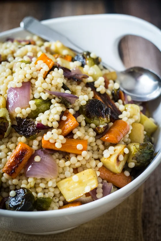 - Add the roasted vegetables to the couscous bowl. Drizzle the dressing over the top and toss well to coat. Serve warm or at room temperature.