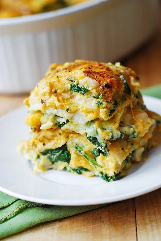 - Prepare a baking dish - I used a casserole dish 11 inches x 8.5 inches x 3 inches deep. Grease the lasagna dish lightly with olive oil spray. Spread 1/3 of butternut squash filling on the bottom of the dish. Sprinkle lightly with mozzarella cheese. Top with cooked lasagna noodles without overlapping (I used 3 noodles).