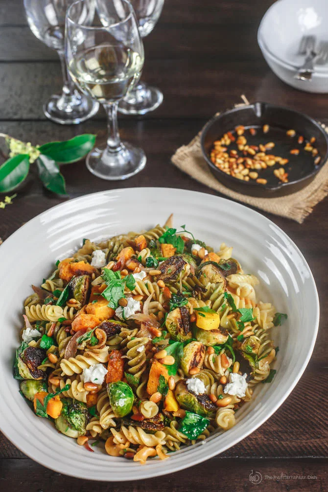 - Now add the cooked pasta to the sauce and stir until the pasta is well coated. Season with a little more salt, black pepper, ground cinnamon, and nutmeg. Stir in the baby spinach and parsley. Then add the cooked butternut squash and brussels sprouts. Cook everything together on medium heat, stirring regularly, until warmed through. Taste and adjust the salt and seasoning to your liking.